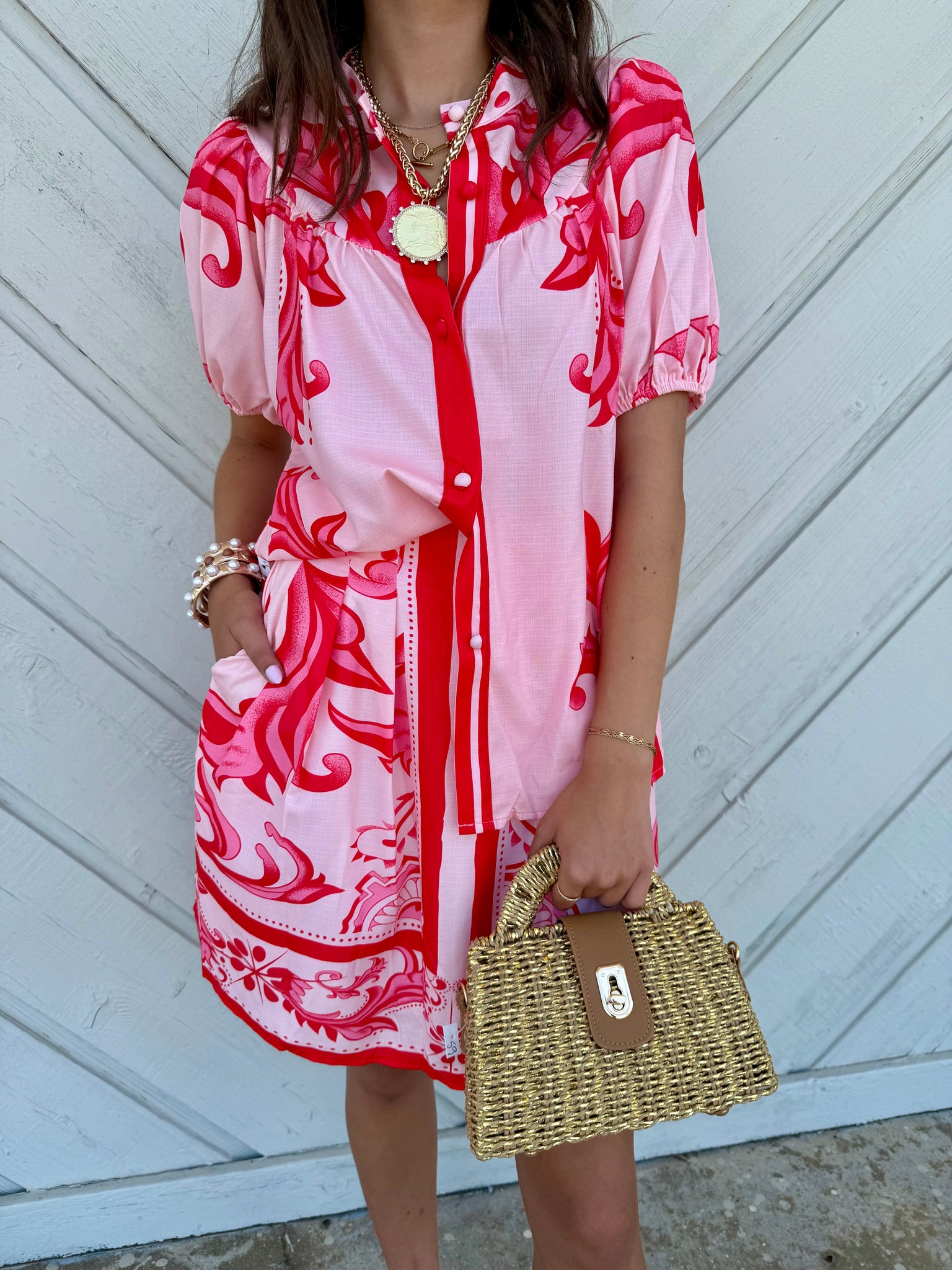 This charming red and light pink set features playful button-up details, creating a sweet and feminine look. Perfectly versatile, it works just as well for a dinner date as it does for a casual day out shopping or strolling around town. The set pairs effortlessly with sneakers for a laid-back vibe or heels for a more dressed-up feel, making it a go-to choice for effortless, stylish outings.