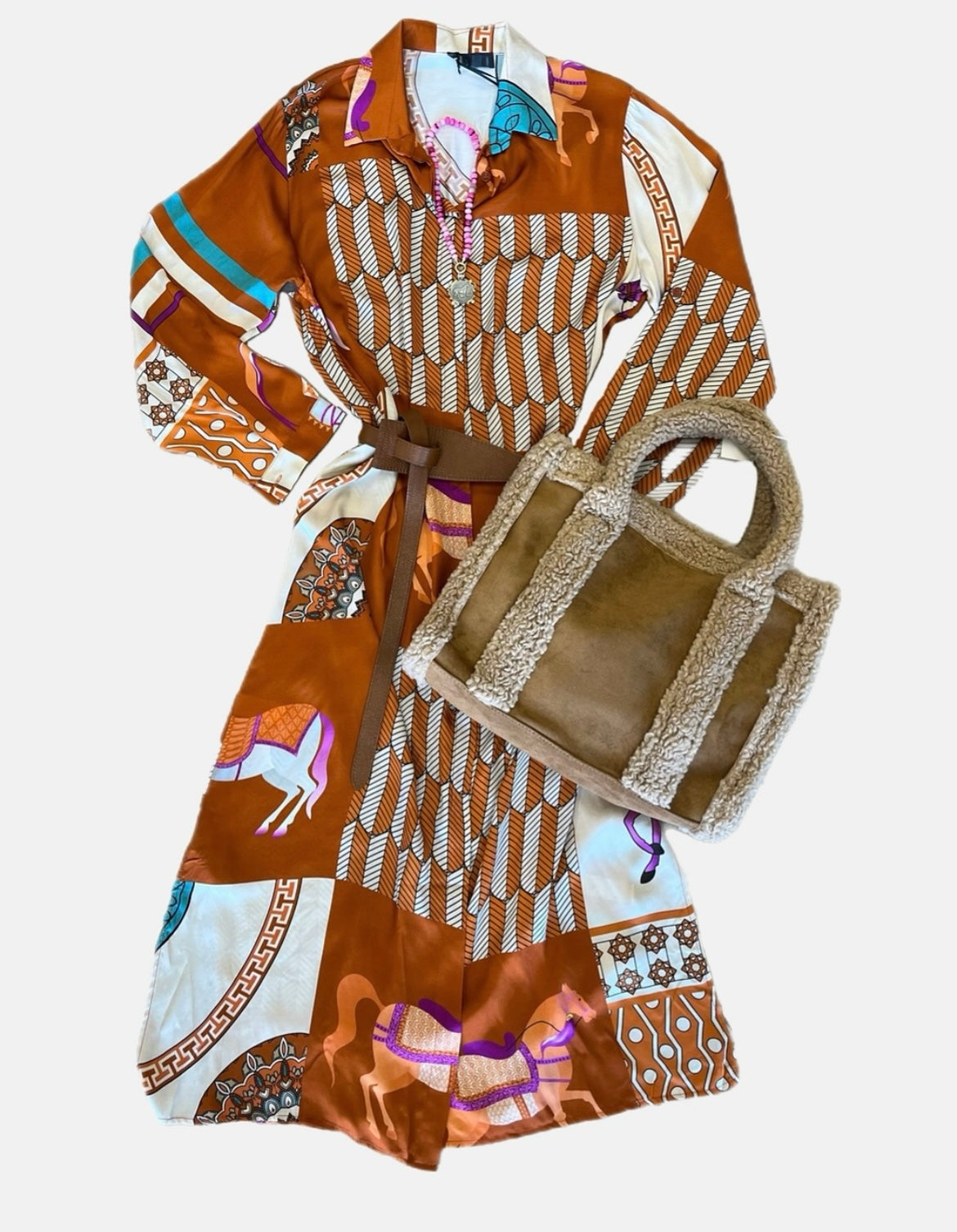 This versatile piece brings bold style and effortless flow to your wardrobe. Designed in a striking orange hue with an allover horse print, it’s a statement-maker that can be worn two ways as a breezy maxi dress or layered open as a lightweight duster.