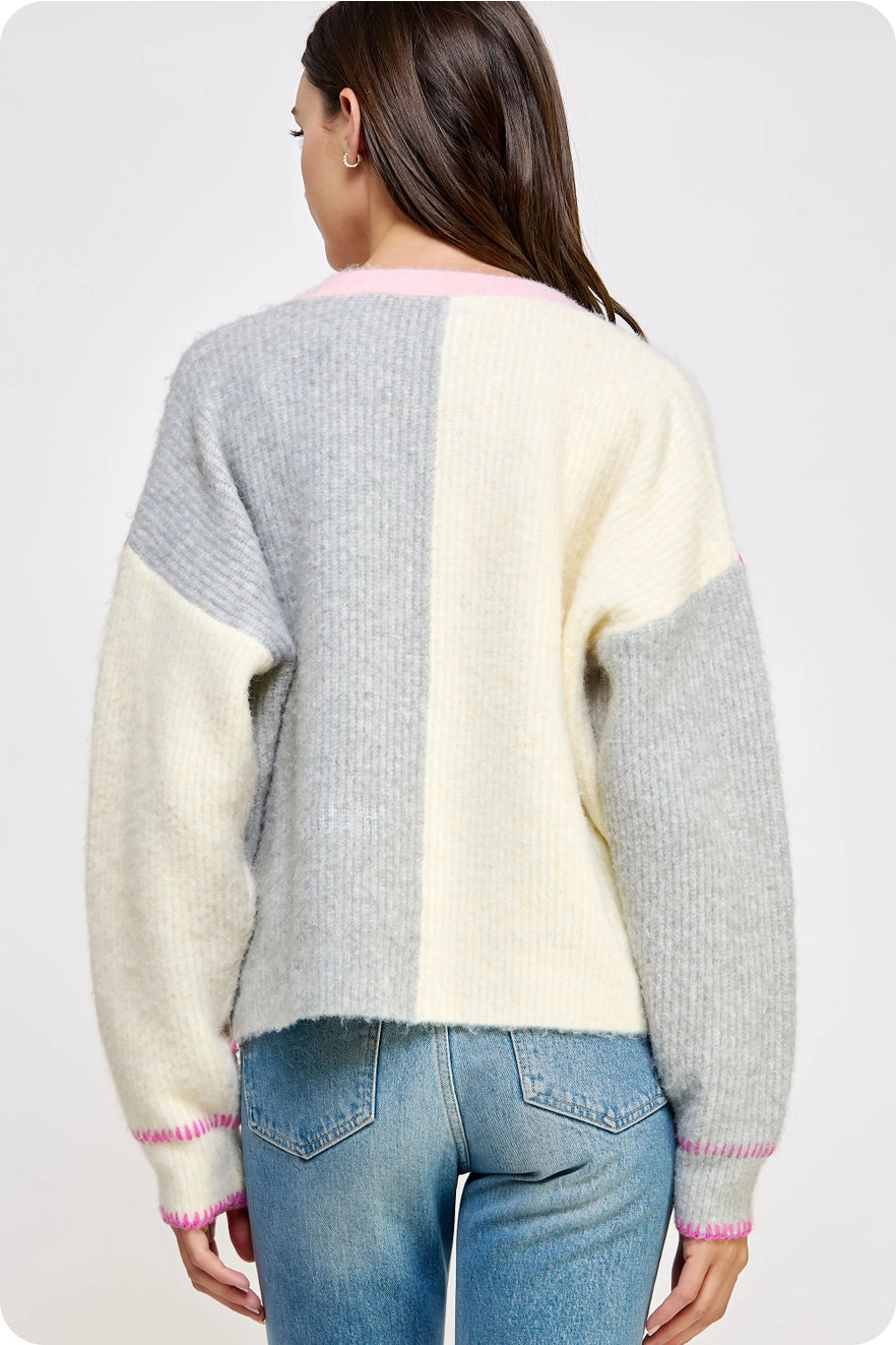 This color block cardigan is a vibrant twist on a cozy classic. Featuring bold, contrasting panels, it’s perfect for adding a pop of color to any outfit while keeping you warm and stylish. Layer it over tees, dresses, or blouses for a fun, effortlessly chic look.
